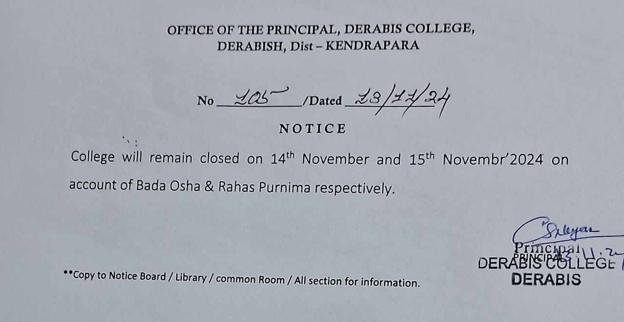 College will remain Closed on Account of Bada Osa and Rasa Purnima