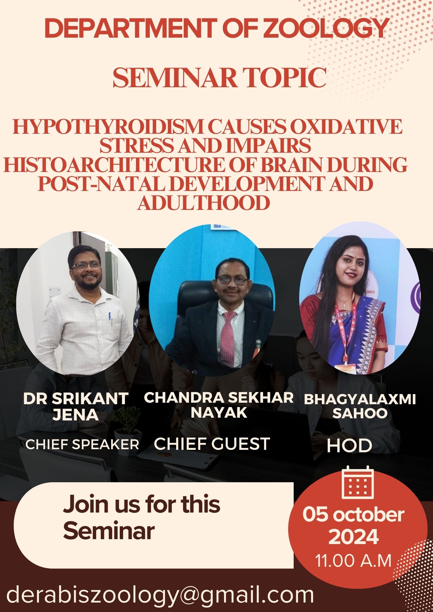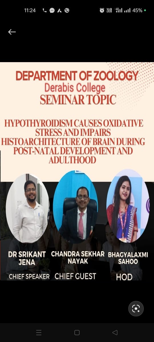 | 05-10-2024 | A seminar organised by the department of Zoology | A seminar organised by the department of Zoology, Derabis College, Kendrapara. Our esteemed speaker Dr. Srikant Jena, Asst. Prof, Ravenshaw University, delivered a thought provoking presentation, highlighting Hypothyroidism and Oxidative Stress. The Session concluded with a lively Q& A session and valuable takeaways. | View File |